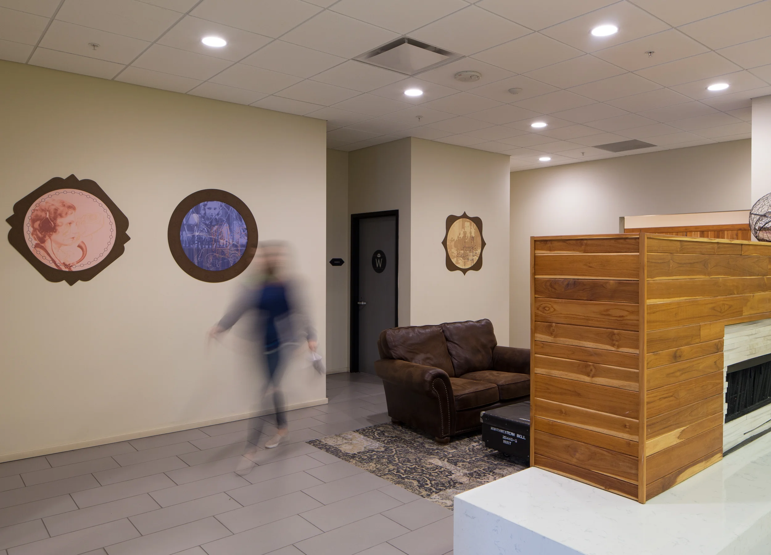 The Wire's entrance plays host to four original phone booths, now clad with branded overlays. The art collection was created using vintage invention drawings, photographs of precursors to the telephone- and switchboards much like what were originally installed in The Wire.